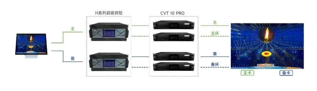 通過雙機4重備份保證現(xiàn)場畫面顯示萬無一失。使用2套系統(tǒng)同時連接顯示屏,雙通道同時輸出信號,4張發(fā)送卡連接箱體主、備接收卡建立信號回路,任意環(huán)節(jié)故障,立即按照優(yōu)先級迅速替換備份信號,整個切換時間控制在微秒級別,確保顯示屏在顯示上不會出現(xiàn)任何異?,F(xiàn)象。